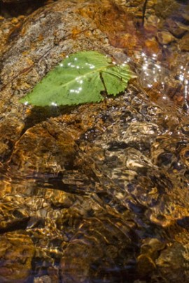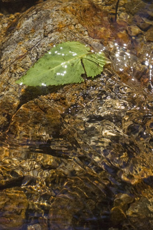 I love this image of the submerged leaf with the fairy dust specular highlights, and the water softly flowing past. It’s very peaceful and calming. It’s almost as if the leaf is being caressed by the water.  I love to hike up the mountains here. Rivers bathed in sunlight look like melted gold. (Yes, …there is gold up in them mountains.) And you return home so much richer.