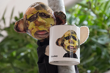 Everyone stood around while I opened the parcel. I don’t want to plug it too much, but I have to say I am very impressed with the quality of the cup and the printing. It looks absolutely fabulous. And the puppets obviously thought the same. The cup was mine for as long as I held it in my hot little hands. Just long enough to admire it. The second I put it down, Monkey grabbed it an dissappeared with it up the scaffolding. I only hope he doesn’t drop it!