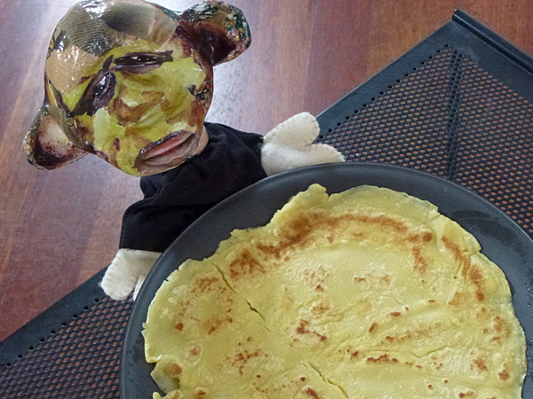 Push Push couldn’t believe that Mouse and Devil published a pancake recipe yesterday. A while ago she promised Monkey she would give her recipe to Mouse as soon as eggs were added to the ingredient list. Naturally, when she found out she was overlooked she came flying into the kitchen, hands on hips, ready for a fight. But Mouse calmed her down and said “you can never have enough pancake recipes. There are so many different ways of making them and pancakes are such a favourite.” She pointed out that the recipe yesterday was an absolute basic one. Push Push agreed and said “pancakes are really brilliant when you first have a go in the kitchen. Absolutely nothing can go wrong. It makes me so cross when I see these expensive pancake mixes on the shelves in the supermarket. They contain dried milk and dried egg, dried everything, all processed. But the hardest work is baking them and you still have to do that yourself.”