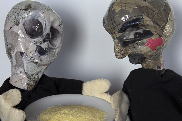 Wait, there is more! Last night Skeleton Edeltraut came into the kitchen. This is a very rare sight, as Edeltraut lives in the closet and doesn’t eat at all! Mouse wondered what brought her into the kitchen. It turns out Skeleton Edeltraut has a big problem. Bad Conscience has moved in with her. You may know that Bad Conscience latches on to other Dedes only to make them feel very, very uncomfortable. He will drag them down if they don’t manage to move him on quickly. Of course he never likes what the other Dedes do and currently he takes great pleasure in poking fun at the Artist’s Survival Cookbook. He informed Skeleton he was a celiac and couldn’t eat anything with gluten. This is why the book is total rubbish.