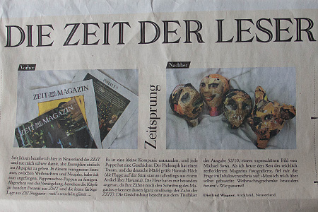 A week into making puppets I photographed some of the heads and emailed two images to the newspaper they are made of (as a tongue-in-cheek before and after comparison). I was delighted when they made it into print. The newspaper is a highbrow weekly with a print-run of half a million.